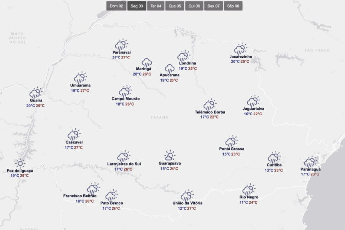 A chuva volta com força ao Estado na quarta-feira. “A formação de um novo sistema de baixa pressão sobre o Paraguai deve provocar chuvas intensas no Oeste paranaense, que avançam em direção às demais regiões ao longo do dia, perdendo força gradualmente”, detalha Bianca. As temperaturas apresentam leve queda, mas as máximas permanecem acima dos 25°C.