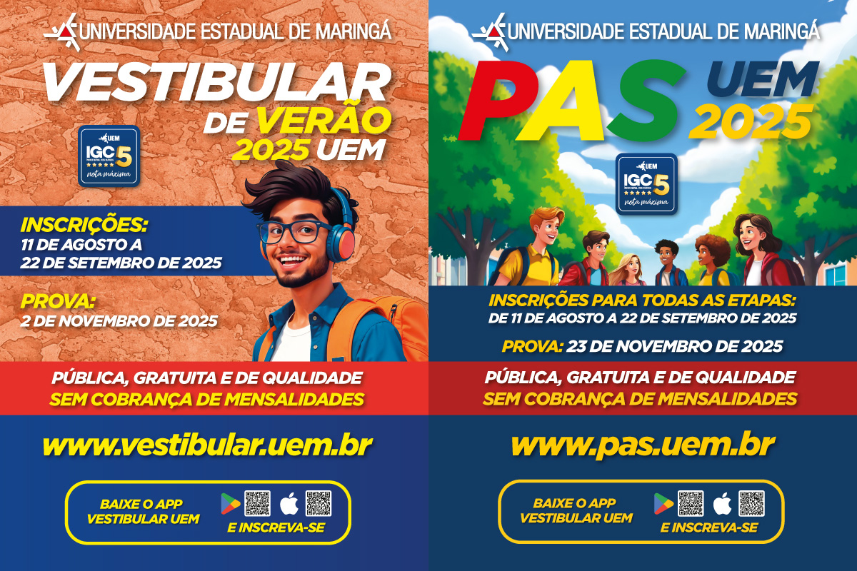 A Comissão Central do Vestibular Unificado (CVU) divulgou nesta sexta-feira (8) os editais de abertura do Vestibular de Verão e do Processo de Avaliação Seriada (PAS) 2025. Os concursos vão selecionar estudantes para mais de 70 cursos de graduação para o ano letivo 2026 da Universidade Estadual de Maringá (UEM). Ao todo, são ofertadas 1.548 vagas.