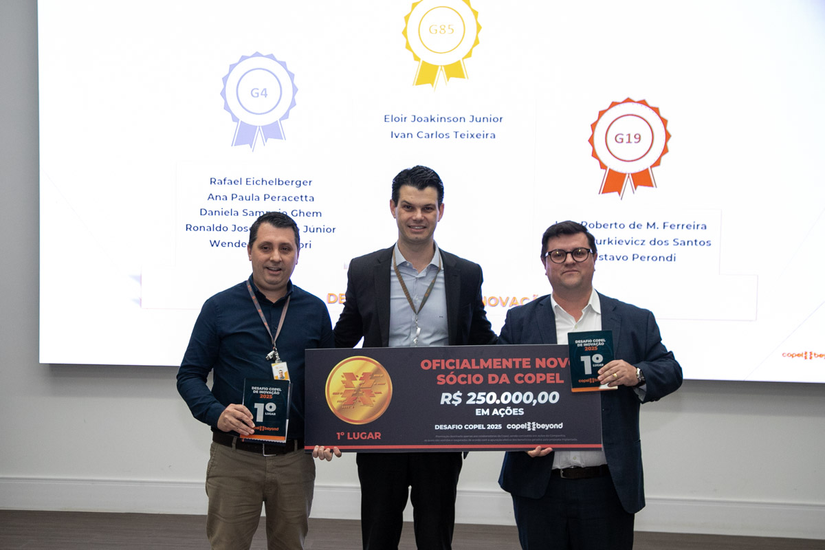 Os integrantes Luiz Roberto de Mendonça Ferreira, Danilo Turkievicz dos Santos e Gustavo Perondi receberam o prêmio de R$ 75 mil concedidos em ações da Copel.