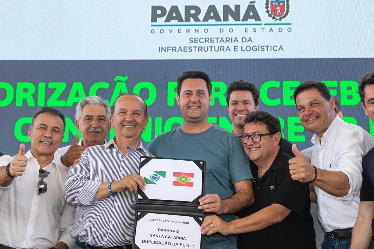 ACORDO – A duplicação da PR-412 foi desenvolvida de forma integrada com os projetos do lado catarinense, garantindo continuidade da rodovia na divisa entre os estados. Durante o evento, Ratinho Junior e o governador de Santa Catarina, Jorginho Mello, assinaram o convênio que permite o avanço do acordo judicial entre os dois estados, homologado pelo Supremo Tribunal Federal, que encerrou uma disputa iniciada em 1991 relacionada a royalties de petróleo.